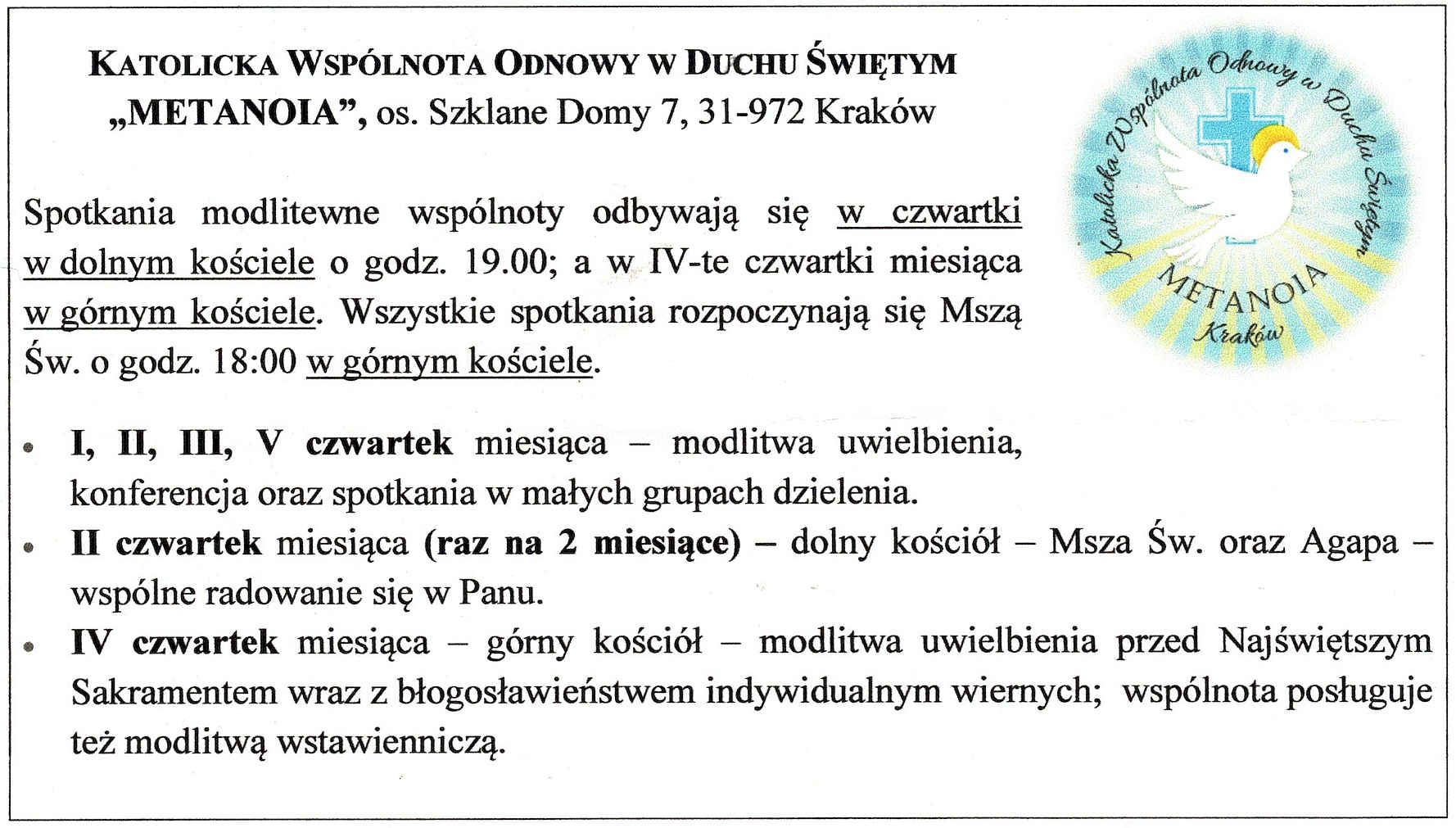 W każdy czwartek (najbliższe spotkanie 19 grudnia br.), Wspólnota Metanoia zaprasza na Eucharystię o 18:00, a następnie o godz. 19:00 na spotkanie w dolnym kościele.